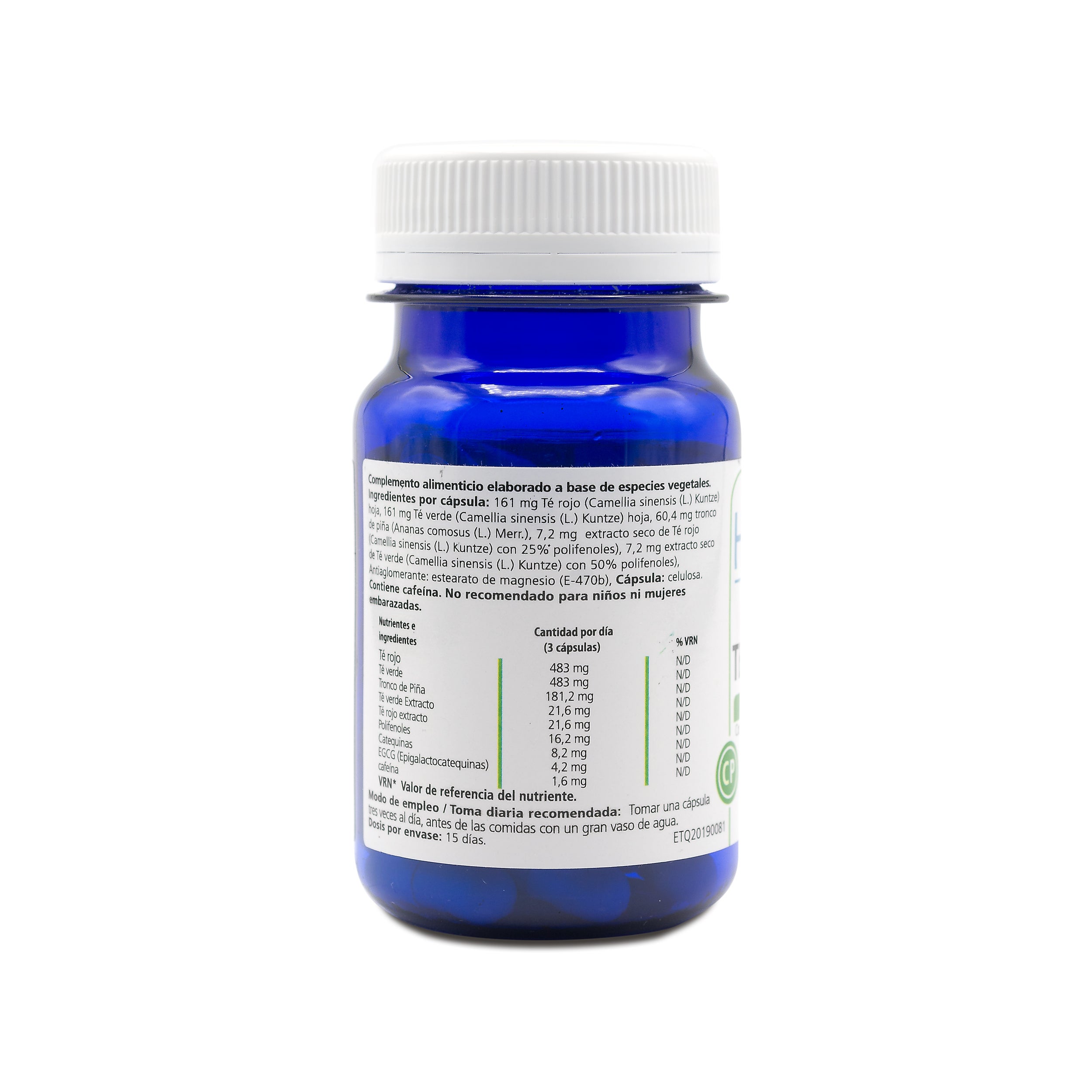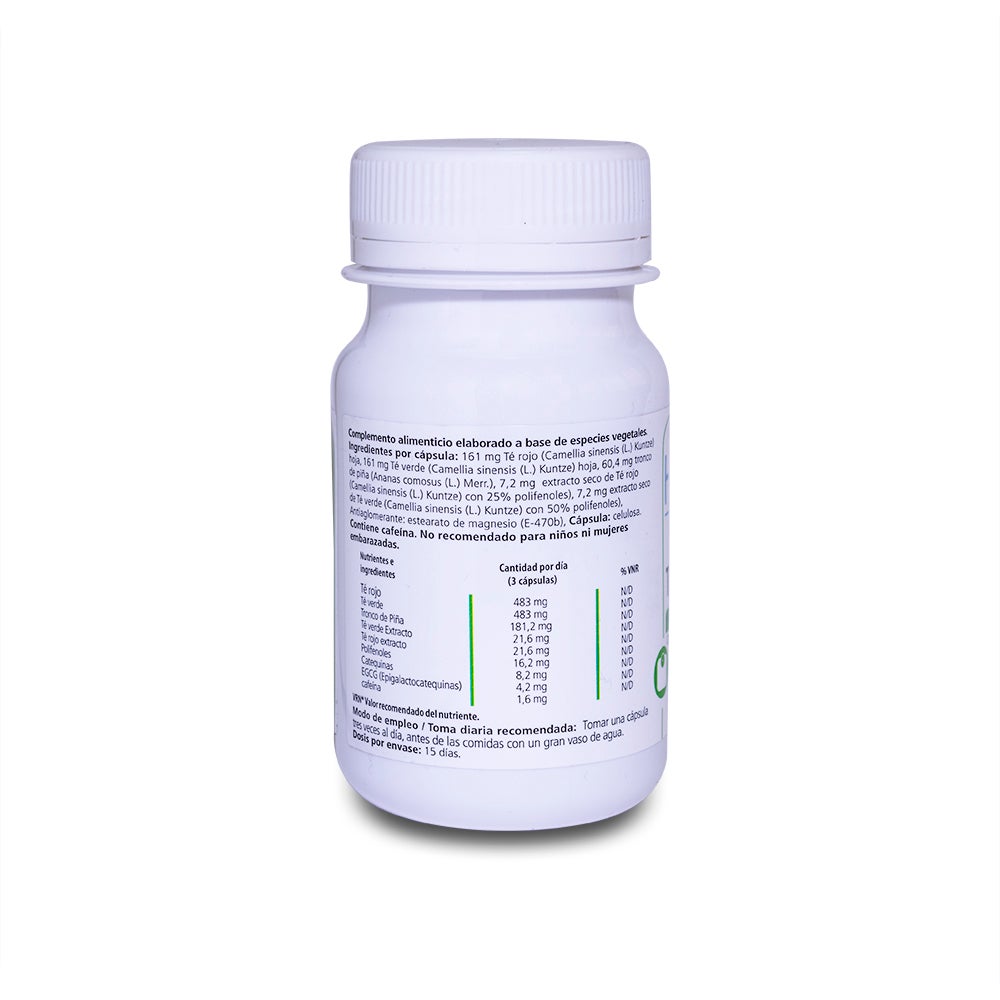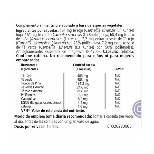 Ingredientes por cápsula: 161 mg de Té rojo (Camelia sinensis (L) Kuntze) hoja, 161 mg Té verde (Camelia sinensis (L) Kuntze) Hoja, 60.4 mg tronco de piña (Ananas comosus (L) Merr) 7.2 mg extracto seco de Té rojo (Camelia sinensis (L) Kuntze con 25% de polifenoles), 7.2 mg extracto seco de Té verde (Camelia sinensis (L) Kuntze con 50% polifenoles) Antiaglomerantes : estearato de magnesio (E470b).
