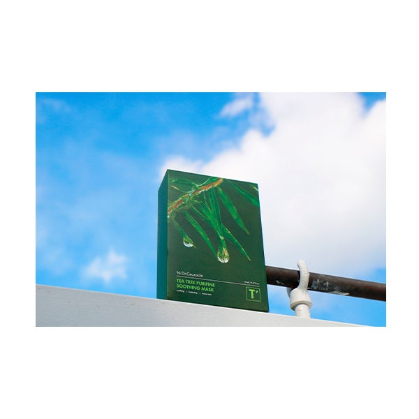 Máscara facial tipo véu à base de extrato de árvore do chá, que acalma a pele acneica combatendo suas erupções.