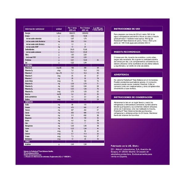 Aviso: Não aqueça PediaSure Teen Balance no micro-ondas. Podem ocorrer queimaduras graves. Um consumo excessivo pode causar desconforto intestinal. Evitar o consumo junto com medicamentos e outros complementos alimentares à base de fibra.