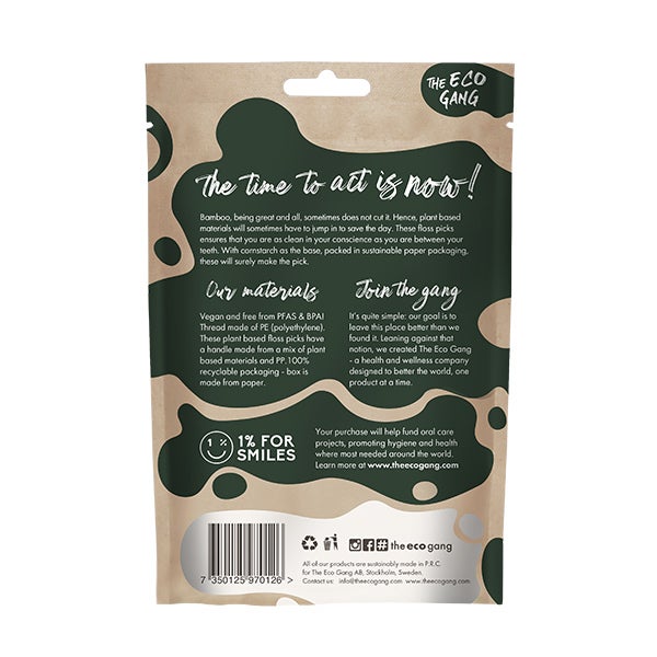 O Eco Gang Floss Pick Carbon é fabricado com materiais de alta qualidade e respeitosos com o meio ambiente. O cabo é feito de amido de milho, um material sustentável e biodegradável. O fio dental é impregnado com carvão ativado, que ajuda a eliminar manchas e manter os dentes brancos e brilhantes.