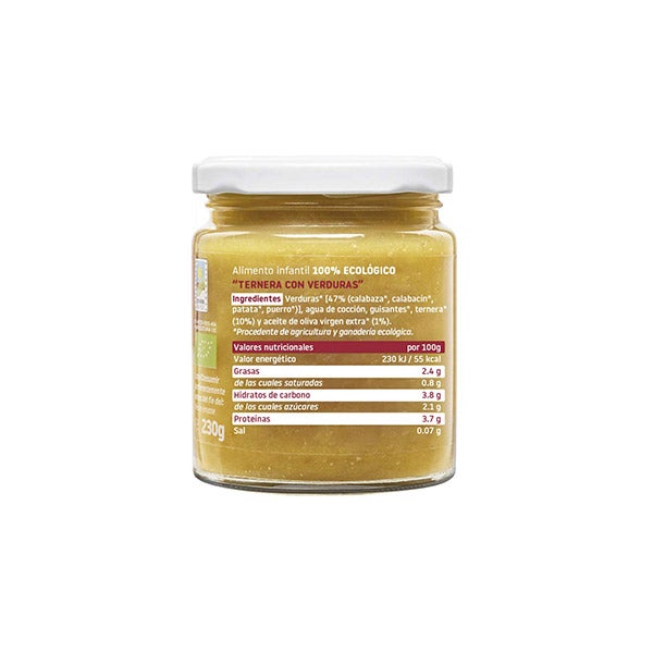 Verduras [4,7% (calabaza, calabacín, patata, puerro)], agua de cocción, guisantes, ternera (10%) y aceite de oliva virgen extra (1%).