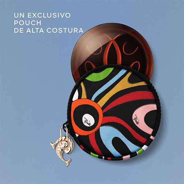 Ideal para proteger e transportar os pós bronzeadores, o estojo Marmo Sun está decorado com um adorno de passamanaria que representa dois peixes dançando um ao redor do outro para formar a letra "P", símbolo emblemático da Maison Pucci.