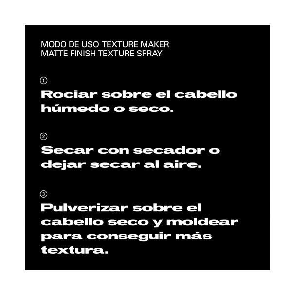 Cabelo úmido: borrife sobre o cabelo úmido antes de secar para uma textura descontraída. Cabelo seco: pulverize e modele com as mãos para uma textura extrema e remodelável.
