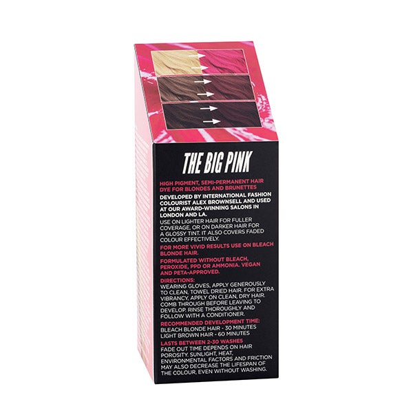 O que faz? Big Pink é um tonalizante capilar semipermanente condicionador que transforma o cabelo em um rosa intenso e vibrante, com duração de 2 a 30 lavagens.