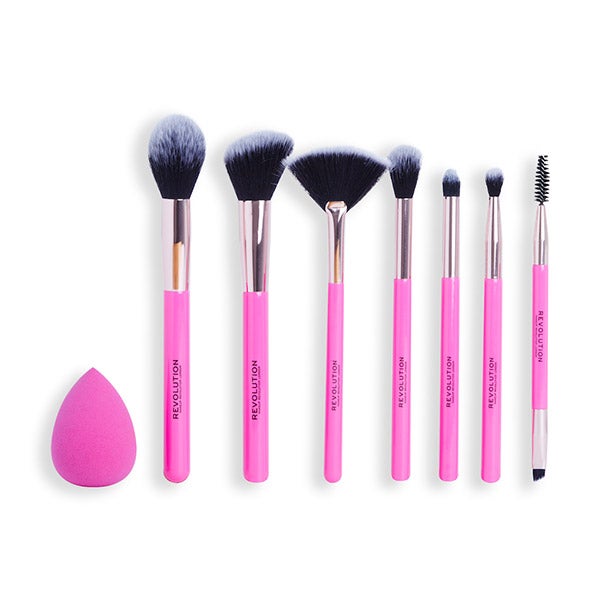 Você encontrará oito ferramentas em uma embalagem colecionável de cor rosa intenso degradê, o presente perfeito para um profissional de maquiagem ou para aquela pessoa especial que quer ampliar sua coleção de pincéis.