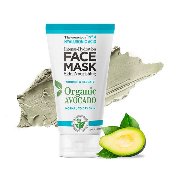 A consciente máscara facial nutritiva e hidratante instantaneamente com ácido hialurônico e óleo de abacate orgânico que ajuda a recuperar a elasticidade para suavizar, repor e melhorar a barreira da pele para uma aparência saudável, flexível, suave e bem hidratada.