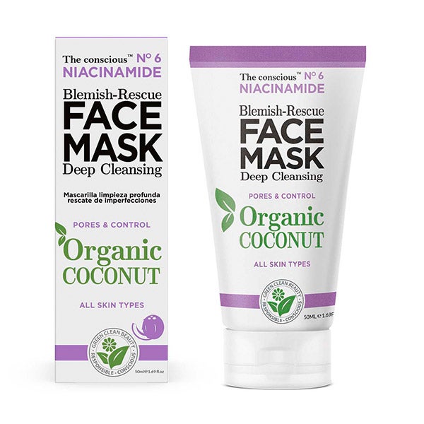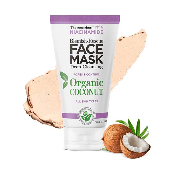 A consciente máscara facial de limpeza profunda de poros com niacinamida e óleo de coco orgânico ajuda a diminuir a aparência de imperfeições e poros ao eliminar a gordura e a sujeira para uma pele purificada e suave com uma tez clara.