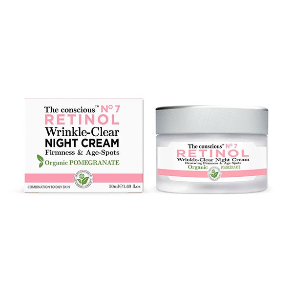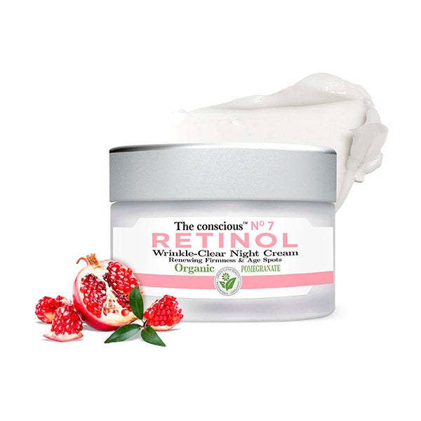 The conscious Creme de noite anti-rugas para uma transformação noturna com retinol renovador da pele e óleo de romã orgânico hidrata profundamente a pele e suaviza sua textura para combater os sinais do envelhecimento e restaura uma aparência e sensação claras, firmes e rejuvenescidas.