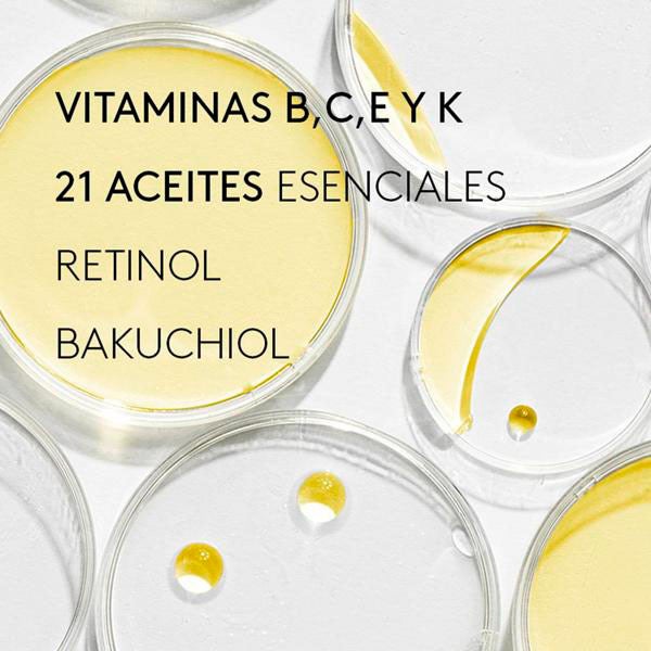 SESAMUM INDICUM (SESAME) SEED OIL, HELIANTHUS ANNUUS (SUNFLOWER) SEED OIL*, SIMMONDSIA CHINENSIS (JOJOBA) SEED OIL*, PRUNUS AMYGDALUS DULCIS (SWEET ALMOND) OIL*, ROSA CANINA FRUIT OIL, PLUKENETIA VOLUBILIS SEED OIL*, SQUALANE, CORYLUS AVELLANA (HAZEL) SEED OIL*, ARGANIA SPINOSA KERNEL OIL*, BAKUCHIOL, CALENDULA OFFICINALIS FLOWER EXTRACT*,OLEA EUROPAEA (OLIVE) FRUIT OIL, OPUNTIA FICUS-INDICA SEED OIL, MACADAMIA TERNIFOLIA SEED OIL, ROSA MOSCHATA SEED OIL, ROSA DAMASCENA EXTRACT, PASSIFLORA EDULIS FRUIT EXTRACT, AMYRIS BALSAMIFERA BARK OIL, SALVIA LAVANDULIFOLIA LEAF/STEM OIL, CITRUS AURANTIUM BERGAMIA (BERGAMOT) PEEL OIL, PELARGONIUM GRAVEOLENS OIL, ANIBA ROSAEODORA (ROSEWOOD) WOOD OIL, TOCOPHEROL, ROSMARINUS OFFICINALIS (ROSEMARY) LEAF EXTRACT, BETA-SITOSTEROL, SQUALENE, GLYCINE SOJA (SOYBEAN) OIL, BENZYL BENZOATE**,LINALOOL**, CITRONELLOL**, LIMONENE**, CITRAL**, GERANIOL** Ingredients from organic farming / Ingredientes procedentes del cultivo ecológico *Naturally found in essential oils /Se encuentran de manera natural en los aceites esenciales