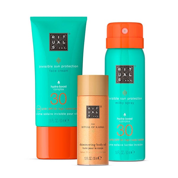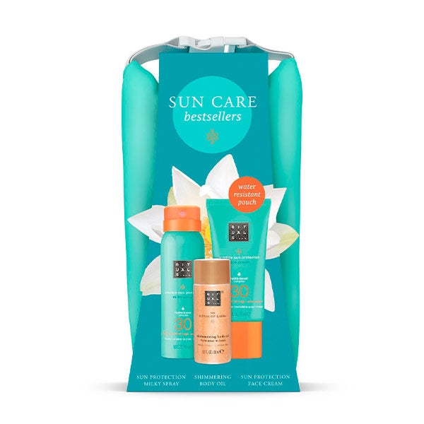 Dentro encontrarás una crema facial con protección solar SPF30, una loción solar en espray SPF30 y un aceite corporal brillante para una piel bronceada y perfecta.
