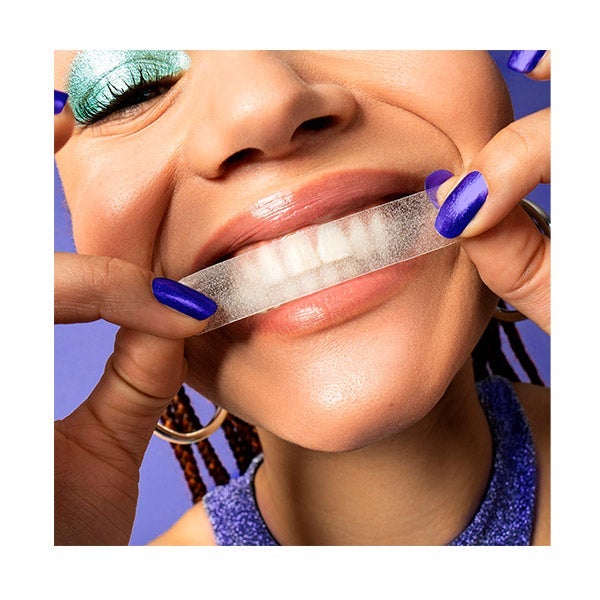 2) Coloque as tiras nos seus dentes superiores e inferiores. Deixe agir entre 30 e 45 minutos.