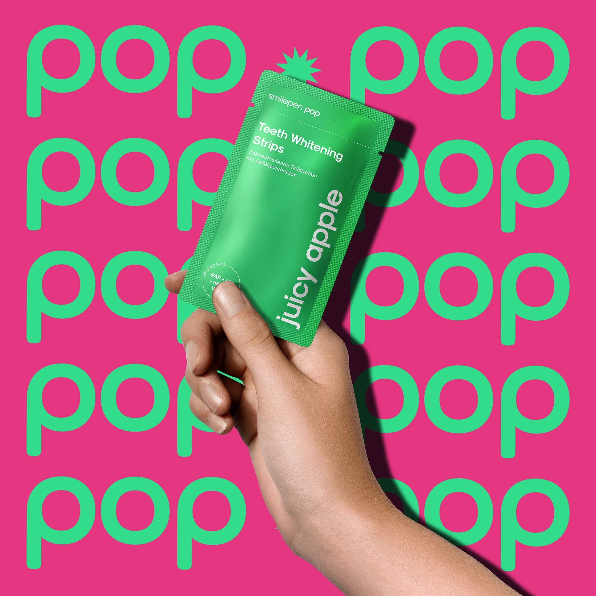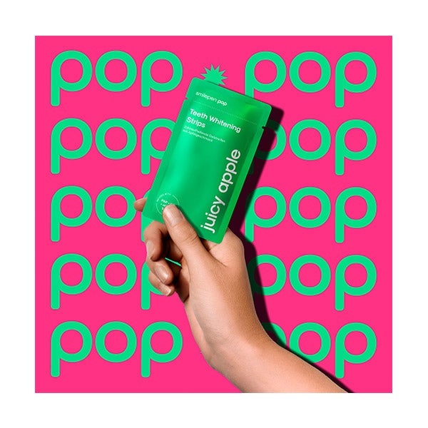 A fórmula patenteada da Smilepen nas tiras Pop para clareamento dental também contém ingredientes que fortalecem e nutrem o esmalte dental e as gengivas.