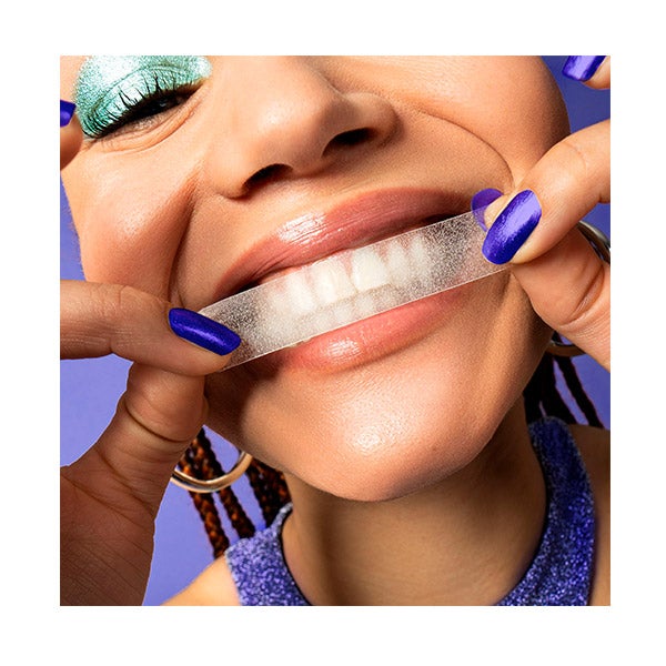2) Coloque as tiras nos seus dentes superiores e inferiores. Deixe agir entre 30 e 45 minutos.
