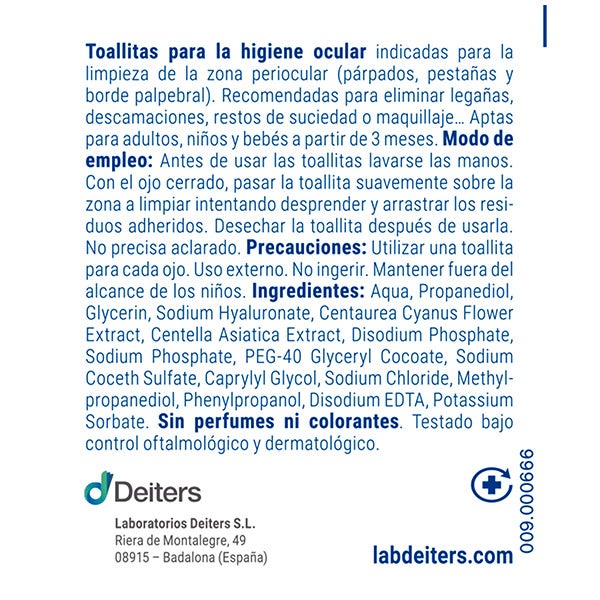 Utilizar um toalhete para cada olho. Uso externo. Não ingerir. Manter fora do alcance das crianças. Se é usuário de lentes de contato, remova-as antes de passar o toalhete. Não utilizar se for alérgico a algum dos seus componentes. Adequados para adultos, crianças e bebês a partir de 3 meses.