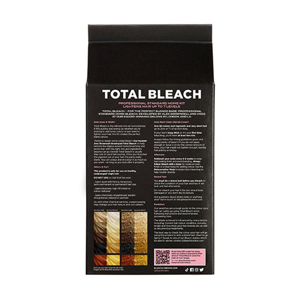 Para quem é? Total Bleach é adequado para todos os tipos e cores de cabelo. A escolha do kit descolorante depende do seu cabelo e do tom e clareamento que você deseja. A melhor maneira de verificar a cor que você obterá e como ficará após usar o Total Bleach é com um teste em uma mecha.