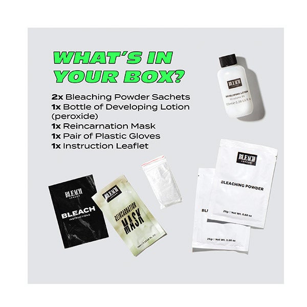 O que inclui? 2 sachês de pó descolorante de 25 g, 1 frasco de loção reveladora (30 vol. | 9%), 1 sachê da nossa máscara restauradora de ligações Reincarnation de 15 ml, 1 par de luvas de plástico.