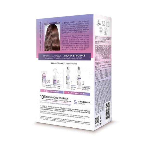 Um sistema de dois passos com fórmulas poderosas que reconstruem as ligações de queratina e revertem os danos do cabelo causados por tinturações, descolorações, exposições a altas temperaturas, raios UV ou o passar dos anos.