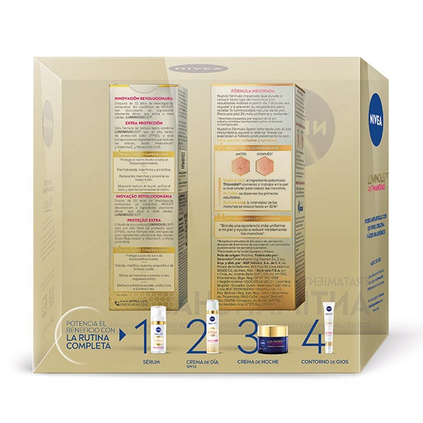 LUMINOUS630 Sérum Antiedad y Antimanchas 2 en 1: Aqua, Glycerin, Caprylic/Capric Triglyceride, Cocoglycerides, Methylpropanediol, Glyceryl Stearate, Cetearyl Alcohol, Distarch Phosphate, Tapioca Starch, Butyrospermum Parkii Butter, Cetyl Palmitate, Squalane, Isobutylamido Thiazolyl Resorcinol, Glycine Soja Germ Extract, Sodium Hyaluronate, Sodium Stearoyl Glutamate, Ethylhexylglycerin, Xanthan Gum, Trisodium EDTA, Sodium Chloride, Phenoxyethanol, Parfum
