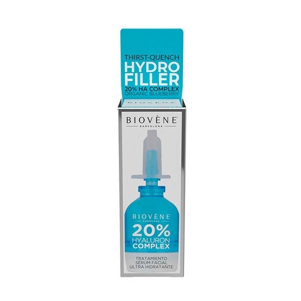 Tratamento de soro facial hidratante para saciar a sede HYDRO FILLER com ácido hialurônico ultra-hidratante e mirtilo orgânico adequado para peles opacas, desidratadas ou secas que mostram os primeiros sinais de envelhecimento.