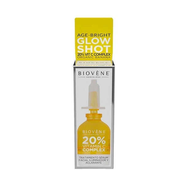 Tratamento de soro facial iluminador e clareador GLOW SHOT com vitamina C antienvelhecimento e banana orgânica adequado para peles opacas e cansadas, hiperpigmentação e sinais de envelhecimento.