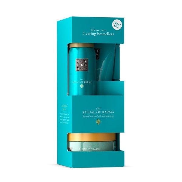 O conjunto de teste The Ritual of Karma contém uma espuma de banho, um creme corporal e um esfoliante corporal.