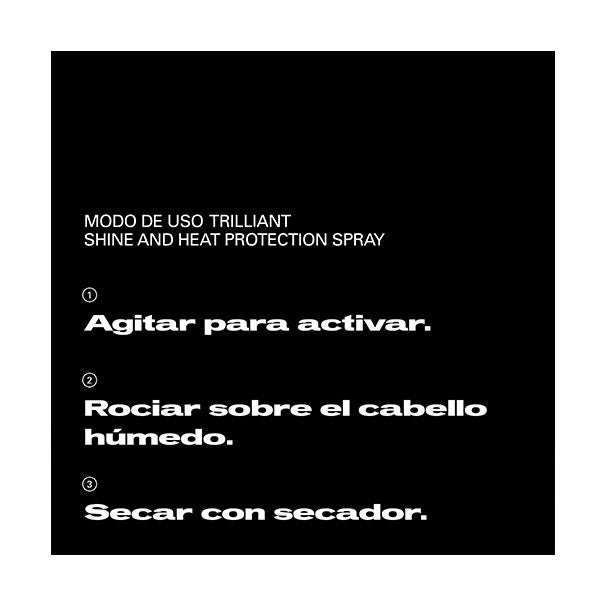 Agite o spray para ativar o complexo Trilliant e aplique sobre o cabelo úmido. Ideal para usar com ferramentas térmicas para melhores resultados.