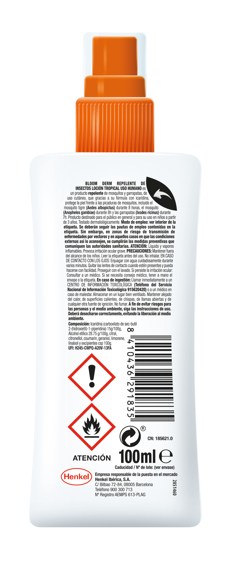 Bloom Derm Loção Tropical protege até 7 horas contra picadas de mosquitos comuns e tigre, carrapatos e mosquitos possíveis vetores do parasita PLASMODIUM e do vírus ZIKA.