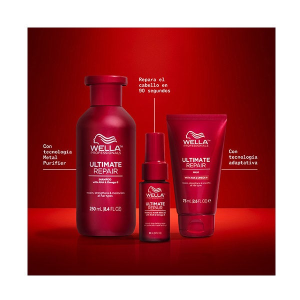 Máscara Ultimate Repair: Para um cabelo mais forte e saudável. Reduz o frizz instantaneamente, da raiz às pontas. Com uma tecnologia patenteada, enriquecida com AHA e Omega-9, e otimizada com tecnologia adaptativa para uma reparação personalizada, conforme o nível de dano do cabelo. Adequada para todos os tipos de cabelo.