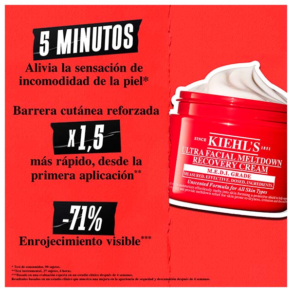 Descubre la crema Ultra Facial Meltdown Recovery de Kiehl’s, una crema hidratante facial apta para pieles sensibles, formulada para calmar y reparar la barrera cutánea con tendencia a la sequedad, la irritación y las molestias. Clínicamente probada para la sensación de incomodidad en 5 segundos*, esta crema ligera con 1% de avena coloidal y α-Bisabolol ayuda a fortalecer la barrera cutánea y reducir el enrojecimiento y la sequedad visibles. La textura de rápida absorción se funde sin esfuerzo en la piel, dejándola suave, calmada y protegida contra los agresores externos.