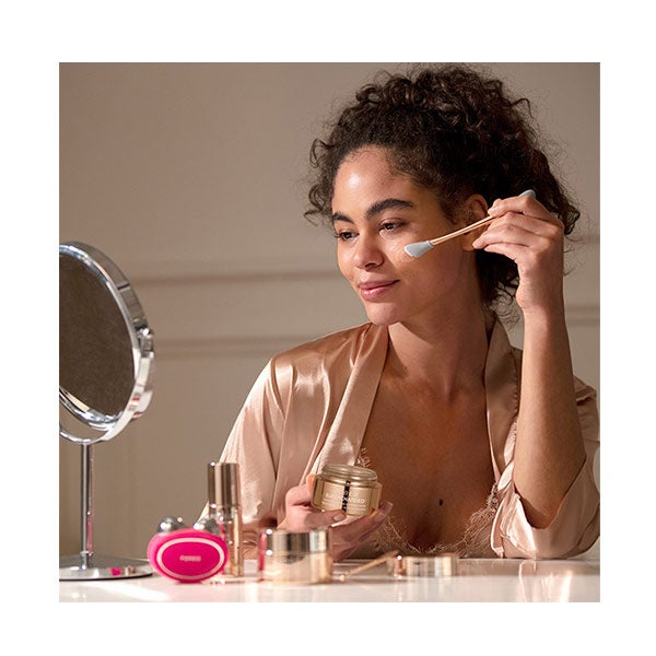 Aplica uma camada generosa de máscara noturna sobre o teu rosto. Deixa que atue durante toda a noite.