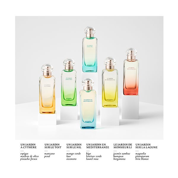A coleção dos Parfums-Jardins constitui o ponto de encontro entre a essência de um lugar, a fonte de inspiração do perfumista e o tema que a maison Hermès escolhe a cada ano para ilustrar sua criação. Um percurso olfativo que convida a desfrutar de cada momento compartilhado e a perseguir o desejo de frescor, de sonhar e de evadir-se.
