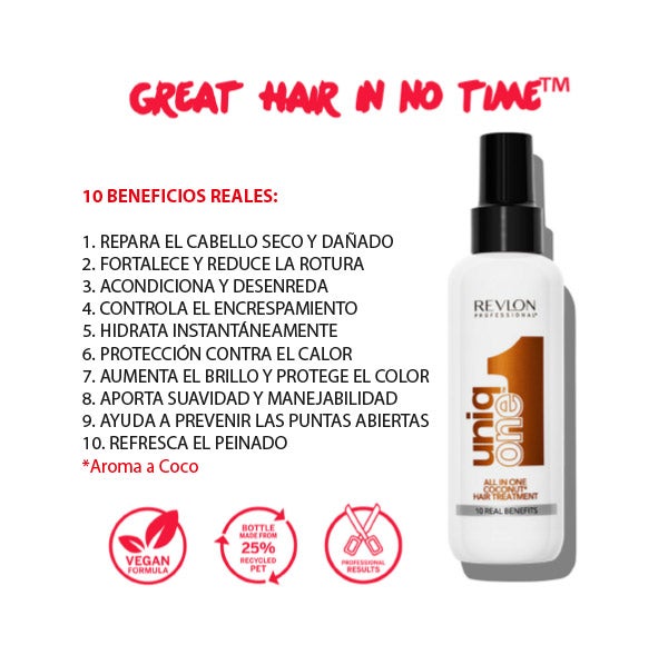 Este tratamento repara o cabelo com sinais de secura, proporciona um extra de brilho e controla o frizz, conta com filtros de proteção UV para manter a cor, oferece suavidade absoluta, proteção térmica, facilita a escovação e o uso de pranchas e modeladores. Desembaraça o cabelo, repara e previne as pontas duplas e nos oferece corpo e volume. Além disso, sua fórmula foi aromatizada com uma fragrância quente e sensual de leite de coco, que nos mergulha em uma experiência sensorial única e irrepetível.