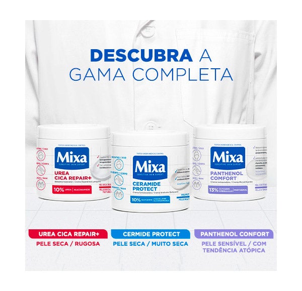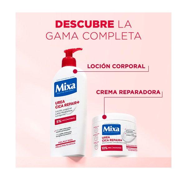 Sente que sua pele precisa de um cuidado um pouco mais intenso do que o oferecido pelo leite corporal? O leite corporal MIXA Urea Cica Repair+ cuidará disso, pois se destaca por sua consistência espessa e sua capacidade de hidratar e nutrir de forma duradoura. Ele proporciona à pele de todo o corpo a suavidade e nutrição que precisa, mima com sua textura cremosa e a deixa protegida do desconforto da secura.