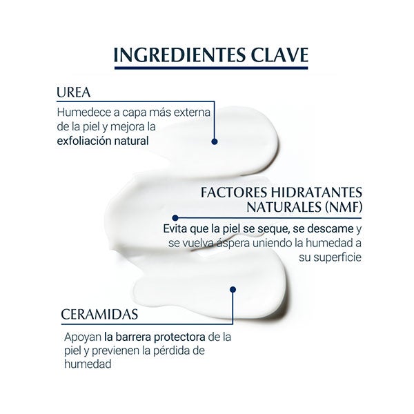 Este creme corporal foi formulado com ureia, que hidrata e melhora a esfoliação natural; fatores naturais de hidratação, que evitam que a pele seque ou descasque; e ceramidas, que protegem a barreira protetora da pele. Esta combinação de ativos suaviza a pele e a torna resiliente à secura, ajudando a manter níveis ótimos de hidratação. Pode ser usado em todo o corpo e é adequado para pessoas com psoríase ou diabetes.