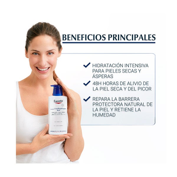 Eucerin Loção UreaRepair Plus 10% Ureia está indicada para pessoas que sofrem de xerose, queratose pilar (pele de galinha), psoríase ou diabetes.