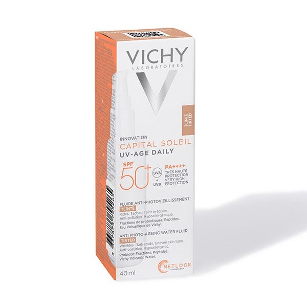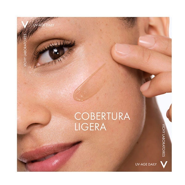 Capital Soleil Uv-Age Daily es un fotoprotector diario de rostro con color que proporciona muy alta protección frente a los rayos UVB y UVA para prevenir los signos del fotoenvejecimiento como manchas y arrugas. Con eficacia antipolución. En una textura water fluid ultraligera de rápida absorción con un acabado invisible mate sin trazas blancas.