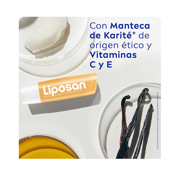 O bálsamo labial Liposan Vanilla Buttercream proporciona aos seus lábios um delicioso aroma de baunilha enquanto os hidrata e cuida. Sua fórmula enriquecida com Manteiga de Karité e óleos de origem natural enriquecidos com Vitaminas tem uma textura suave que se funde instantaneamente nos seus lábios e os mantém hidratados durante 24 horas. Desfrute de lábios deliciosamente macios e com aspecto natural o dia todo. Prontos para beijar e com um aroma que você vai adorar! Compatibilidade com a pele comprovada dermatologicamente.