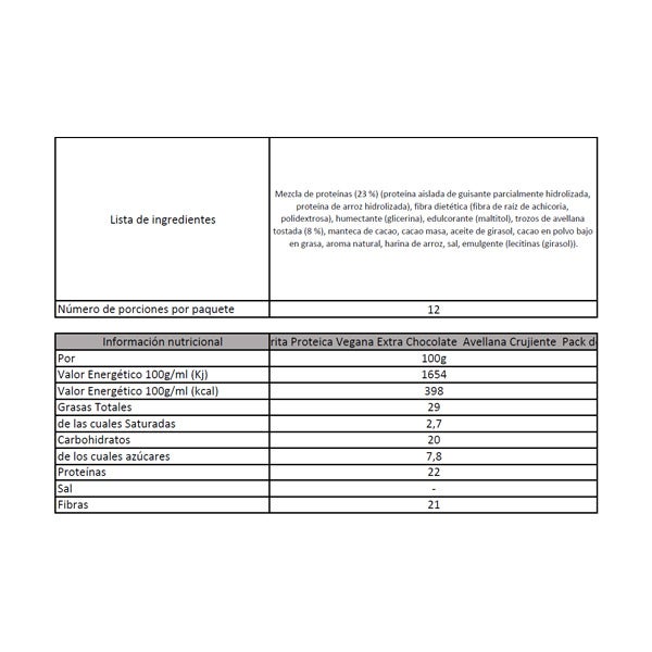 Mezcla de proteínas (23 %) (proteína aislada de guisante parcialmente hidrolizada, proteína de arroz hidrolizada), fibra dietética (fibra de raíz de achicoria, polidextrosa), humectante (glicerina), edulcorante (maltitol), trozos de avellana tostada (8 %), manteca de cacao, cacao masa, aceite de girasol, cacao en polvo bajo en grasa, aroma natural, harina de arroz, sal, emulgente (lecitinas (girasol)).