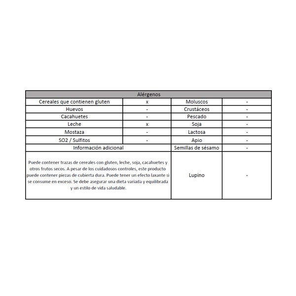 Puede contener trazas de cereales con gluten, leche, soja, cacahuetes y otros frutos secos.