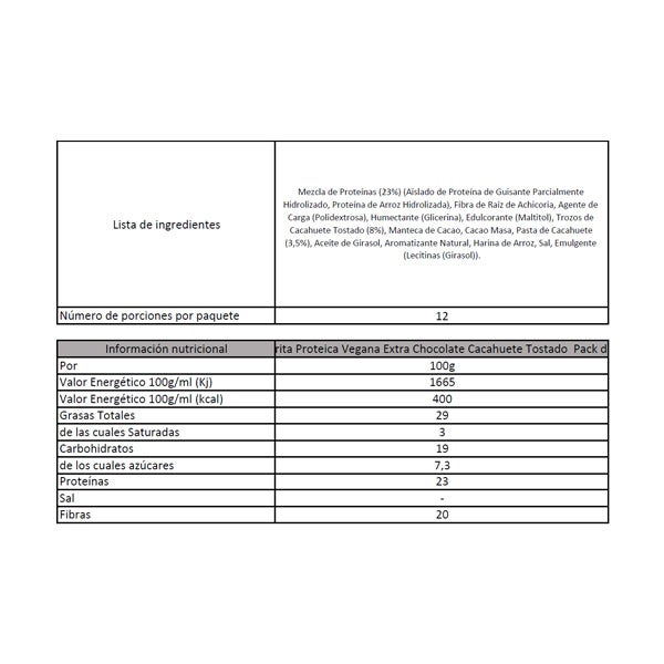 Mezcla de Proteínas (23%) (Aislado de Proteína de Guisante Parcialmente Hidrolizado, Proteína de Arroz Hidrolizada), Fibra de Raíz de Achicoria, Agente de Carga (Polidextrosa), Humectante (Glicerina), Edulcorante (Maltitol), Trozos de Cacahuete Tostado (8%), Manteca de Cacao, Cacao Masa, Pasta de Cacahuete (3,5%), Aceite de Girasol, Aromatizante Natural, Harina de Arroz, Sal, Emulgente (Lecitinas (Girasol)).