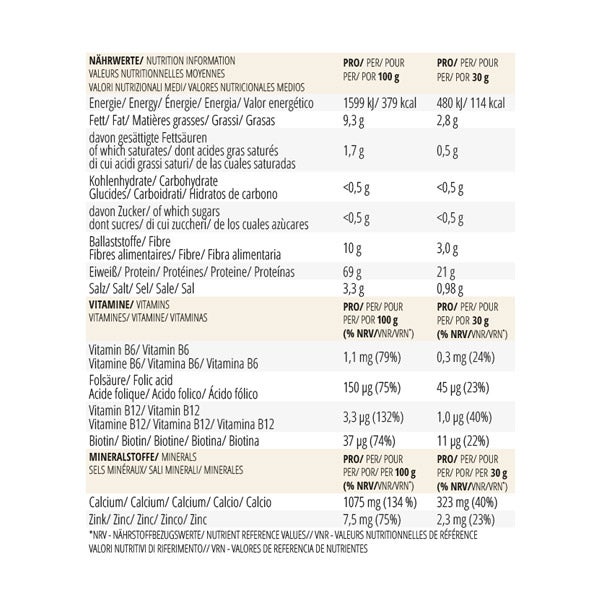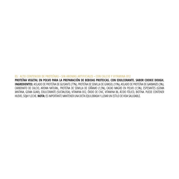 Aislado de proteína de guisante (77%), proteína de semilla de girasol (11%), aislado de proteína de garbanzo (3%), carbonato de calcio, aroma natural, proteína de semilla de cáñamo (1,5%), cacao magro en polvo (1,5%), espesantes (goma xantana, goma guar), edulcorante (sucralosa), vitamina B12, óxido de cinc, vitamina B6, ácido fólico, biotina.