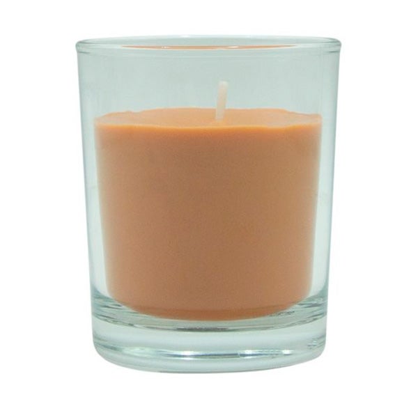 Vela de cera vegetal com fragrância a Canela. Apresentada em copo de vidro 100% reciclável.