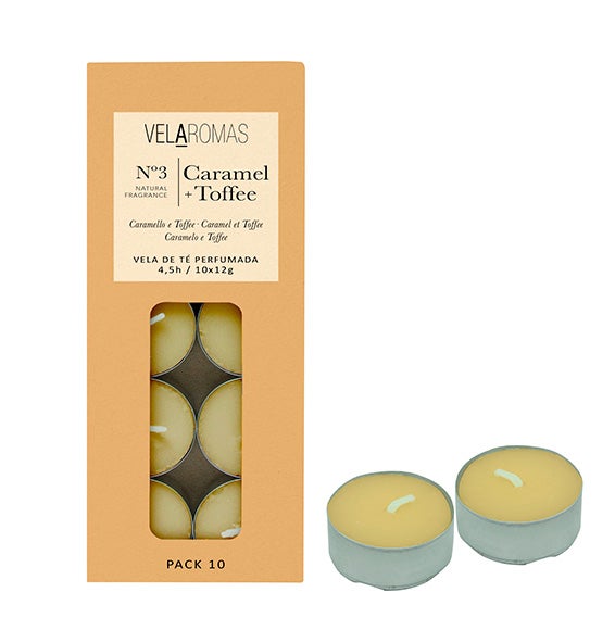 Pacote de 10 minivelas com fragrância de caramelo toffee.