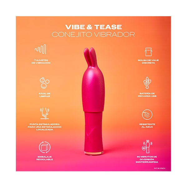 Este brinquedo oferece possibilidades ilimitadas de prazer, tanto sozinho quanto em casal. Seja no chuveiro ou na cama, o Vibe & Tease Coelhinho Vibrador é projetado para te fazer desfrutar e é resistente à água.