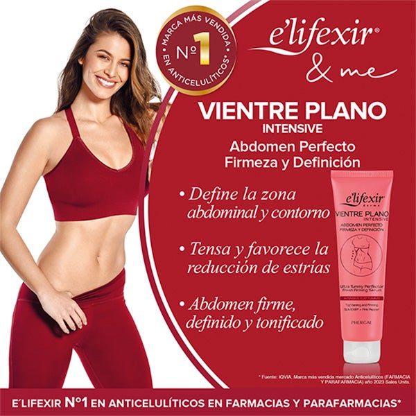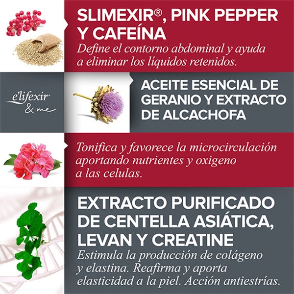 A combinação de ingredientes do creme Elifexir Vientre Plano Intensive proporciona uma pele mais firme, definida e tonificada.
