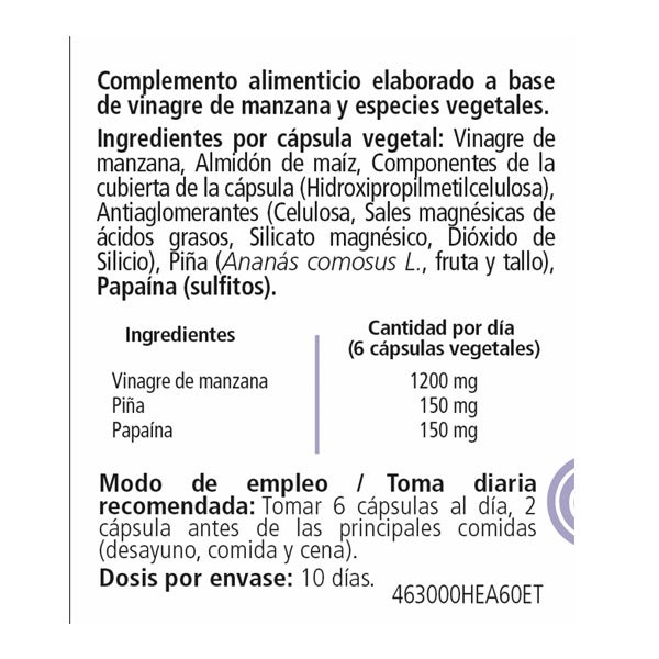 Vinagre de manzana, Almidón de maíz, Componentes de la cubierta de la cápsula (Hidroxipropilmetilcelulosa), Antiaglomerantes (Celulosa, sales magnésicas de ácidos grasos, Silcato magnésico, Dióxido de Silicio) , Piña (Ananás comosus L., fruta y tallo), Papaína (sulfitos)
