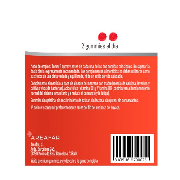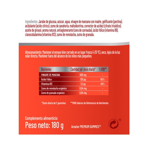Jarabe de glucosa, azúcar, agua, vinagre de manzana con madre, gelificante (pectina), acidulante (ácido cítrico), zumo de zanahoria, maltodextrina, corrector de acidez (citrato trisódico), aceite de girasol, aroma natural, antiaglomerante (cera de carnauba), ácido fólico (vitamina B9), cianocobalamina (vitamina B12), zumo de remolacha, zumo de granada.