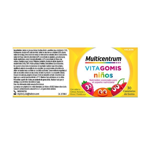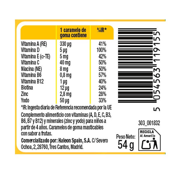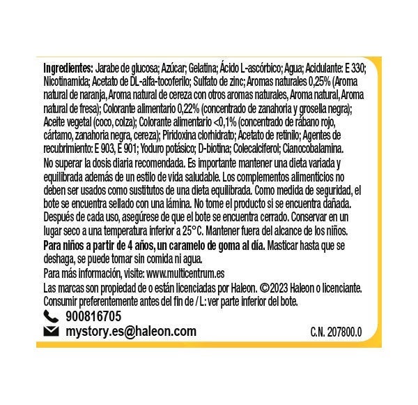 Jarabe de glucosa; Azúcar; Gelatina; Ácido L-ascórbico; Agua; Acidulante: E 330; Nicotinamida; Acetato de DL-alfa-tocoferilo; Sulfato de zinc; Aromas naturales 0,25% (Aroma natural de naranja, Aroma natural de cereza con otros aromas naturales, Aroma natural, Aroma natural de fresa); Colorante alimentario 0,22% (concentrado de zanahoria y grosella negra); Aceite vegetal (coco, colza); Colorante alimentario {0.1% (concentrado de rábano rojo, cártamo, zanahoria negra, cereza) Piridoxina clorhidrato; Acetato de retinilo; Agentes de recubrimiento: E903, E901; Yoduro potásico; D-biotina; Colecalciferol; Cianocobalamina. No superar la dosis diaria recomendada.