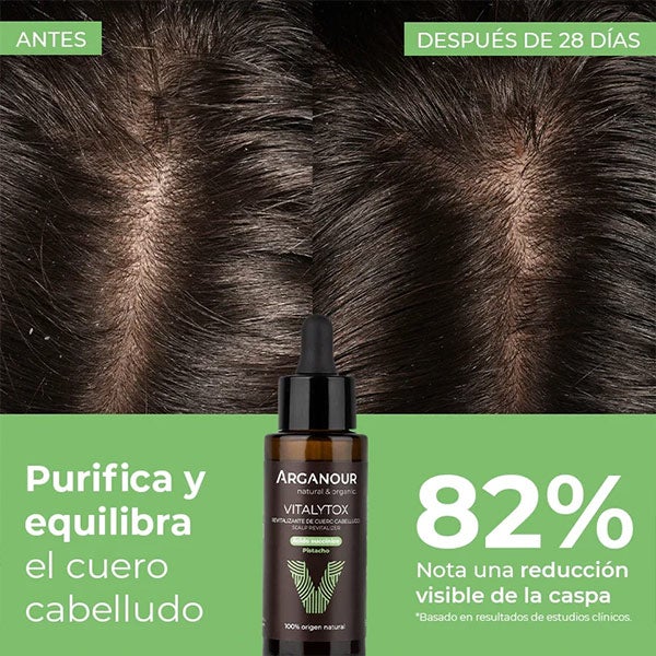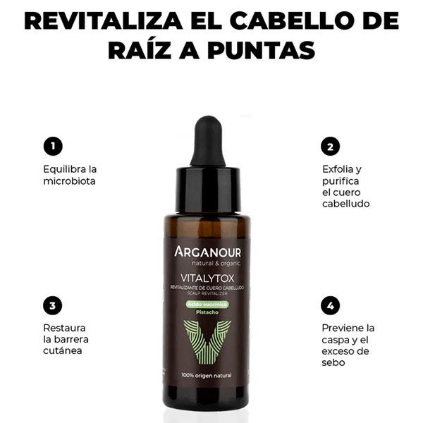 Vitalytox combina ácido succínico para purificar o couro cabeludo e eliminar as células mortas e impurezas que possam obstruir os folículos pilosos; extrato de anis para prevenir o estresse oxidativo, a caspa e o excesso de sebo, ajudando assim a reduzir a inflamação; e, extrato de pistache para hidratar e melhorar a função barreira.