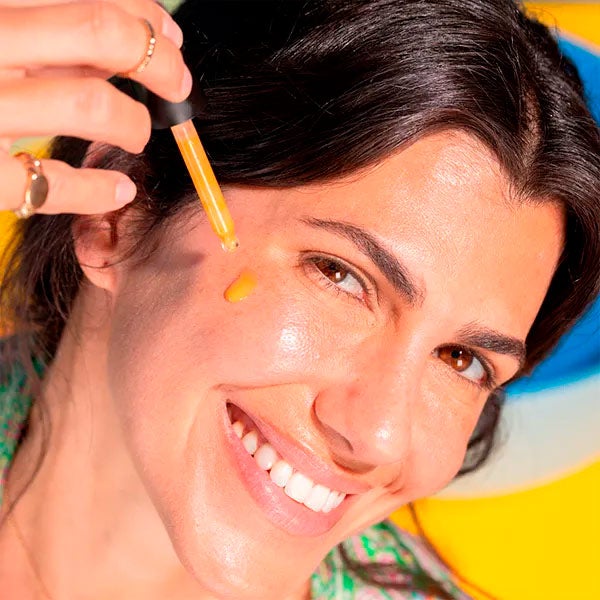 Com a ajuda do conta-gotas, aplique 4 gotas distribuídas entre a testa, as bochechas e o queixo.